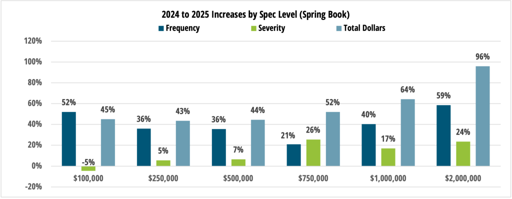 Million-dollar claims present perhaps the most striking picture. Sun Life reported a 61% increase in frequency from 2021 to 2024, including a 29% increase from 2023 to 2024. TMHCC reported a 113% frequency increase from 2021 to 2024, with a 35% rise from 2023 to 20242. QBE documented a 49% increase from 2021 to 2024 and a 32% increase from 2023 to 20244. From 2022 to 2025, Spring’s internal data shows a 131% increase in frequency. Total claim dollars exceeding $1 million have increased by over 200% from 2023 to 2025.